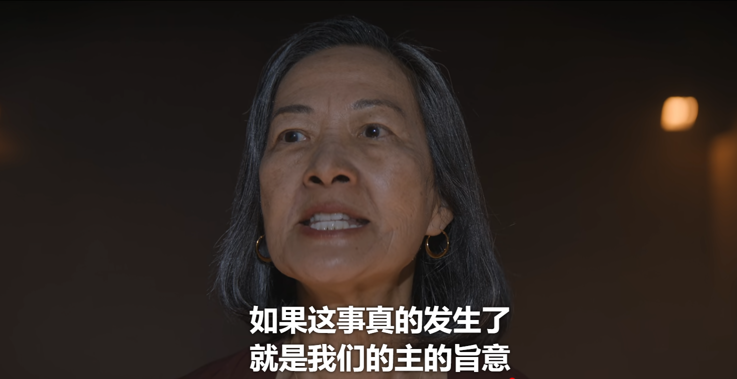 於是觀眾便能欣賞到:在ETO總部開會被突然襲擊的葉文潔會勸其他人停止抵抗,並説“如果這事發生了,就是我們的主的旨意”;在伊文斯逃跑失敗即將面臨死亡之際,會把裝有信息的硬盤捂在胸口,跪地喃喃自語“原諒我,我的主”。