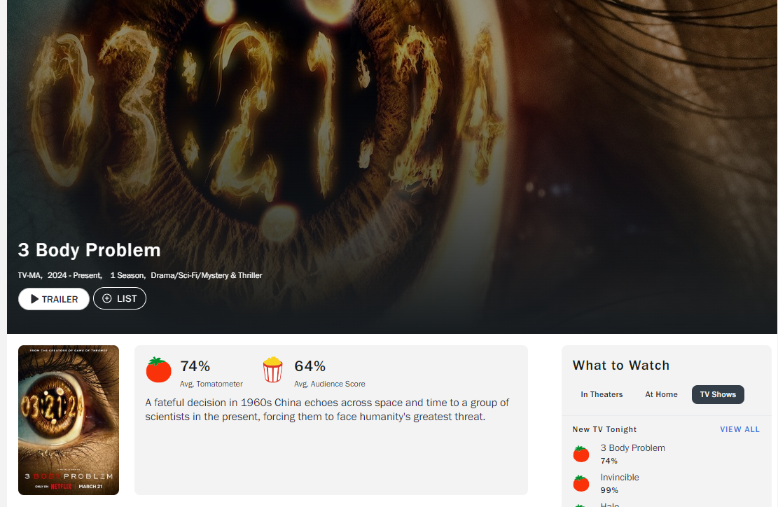 北京時間2024年3月21日下午3時,網飛版《三體》正式上架流媒體,一次性放出第一季的八集全部內容。這部改編自中國著名科幻小説家劉慈欣同名作品的電視劇,在燒掉1.6億美元、歷經3年左右的拍攝剪輯之後,終於卸下了神秘面紗同滿懷期待的網友們見面。