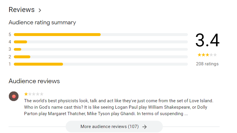 在海外,該劇於谷歌搜索頁上收穫了3.4分(滿分10分)的評分,於爛番茄上收穫了74%的番茄指數(專業影評人評分)和64%的爆米花指數(觀眾評分),IMDb上收穫了7.3分(滿分10分)的評分。