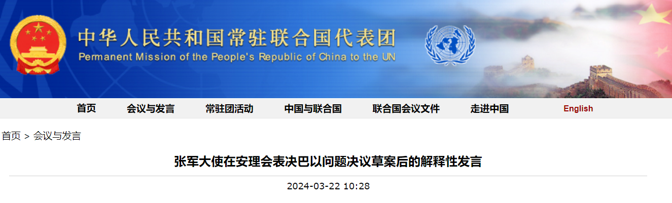 中華人民共和國常駐聯合國代表團網站消息,張軍大使在安理會表決巴以問題決議草案後進行解釋性發言: