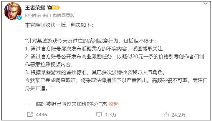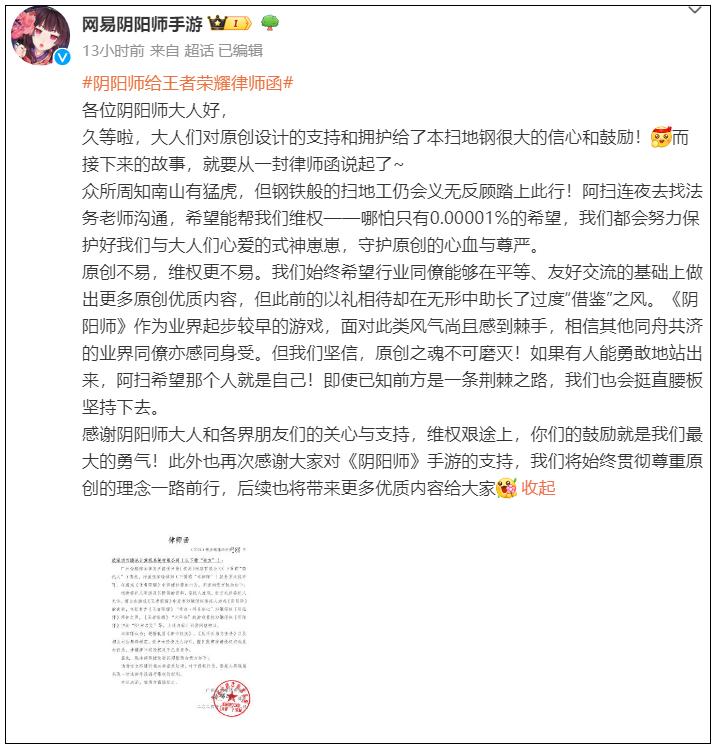 3月22日,@網易陰陽師手遊 發佈對騰訊《王者榮耀》的律師函,指責《王者榮耀》多個角色抄襲《陰陽師》。對此,@王者榮耀 發文回應稱此為詆譭和不實消息,並指責“某些遊戲”多次涉嫌抄襲己方人氣角色。