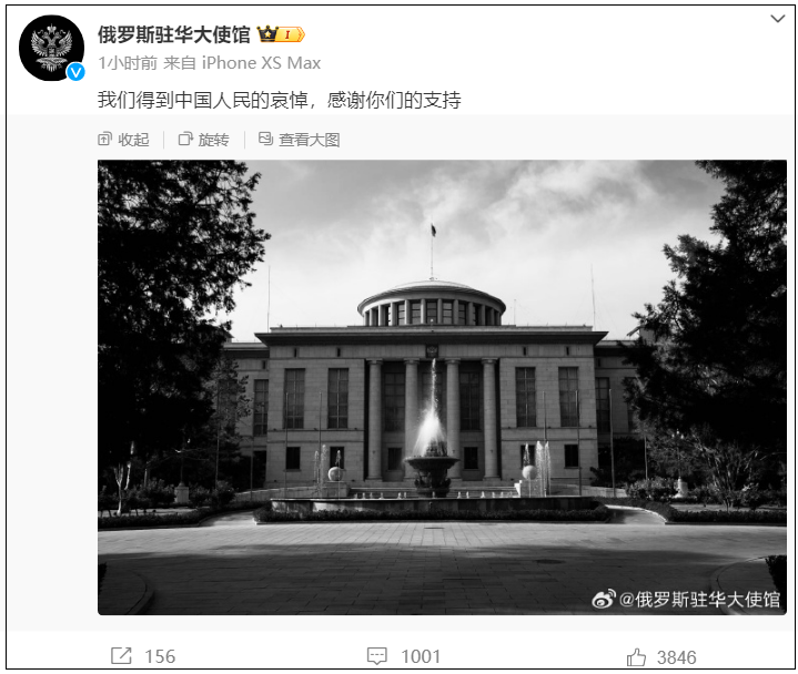俄使館寫道:“我們得到中國人民的哀悼,感謝你們的支持。”