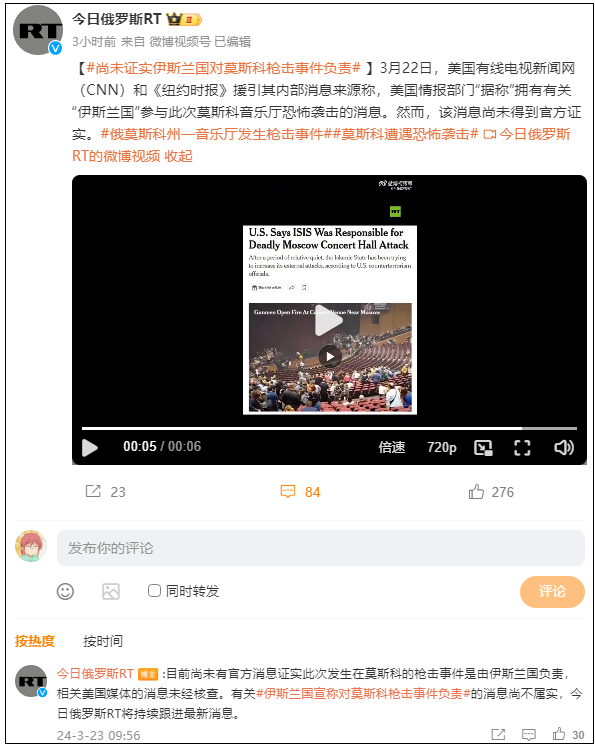 (觀察者網訊)3月23日,@今日俄羅斯RT 官方微博表示,尚未證實“伊斯蘭國”對莫斯科槍擊事件負責。