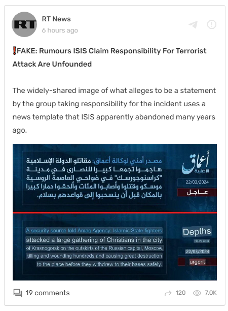 “今日俄羅斯”也通過其電報頻道發佈消息,稱有關“伊斯蘭國”宣稱對莫斯科槍擊事件負責的消息“尚不屬實”,此前流傳的“伊斯蘭國”宣稱負責的聲明圖片的模板,在數年前已經被該組織停用。