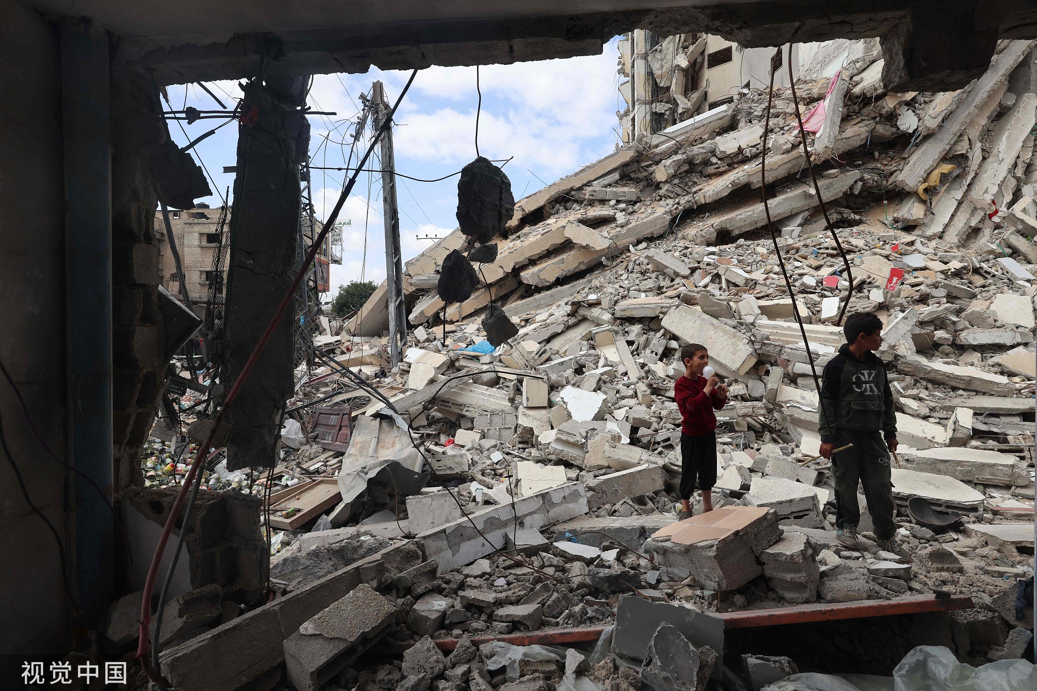 當地時間3月22日,加沙地帶拉法,巴勒斯坦兒童站在以軍轟炸後的廢墟上 圖源:視覺中國