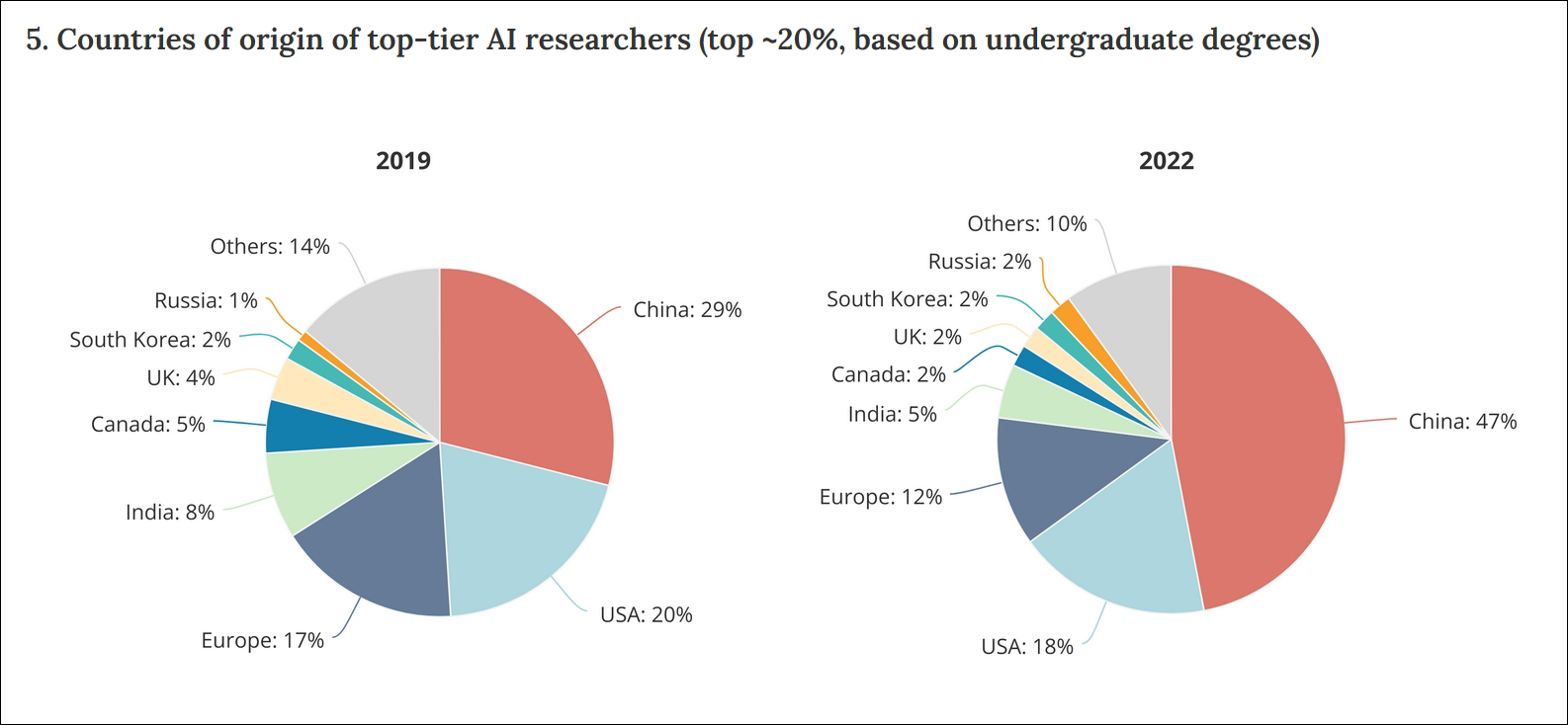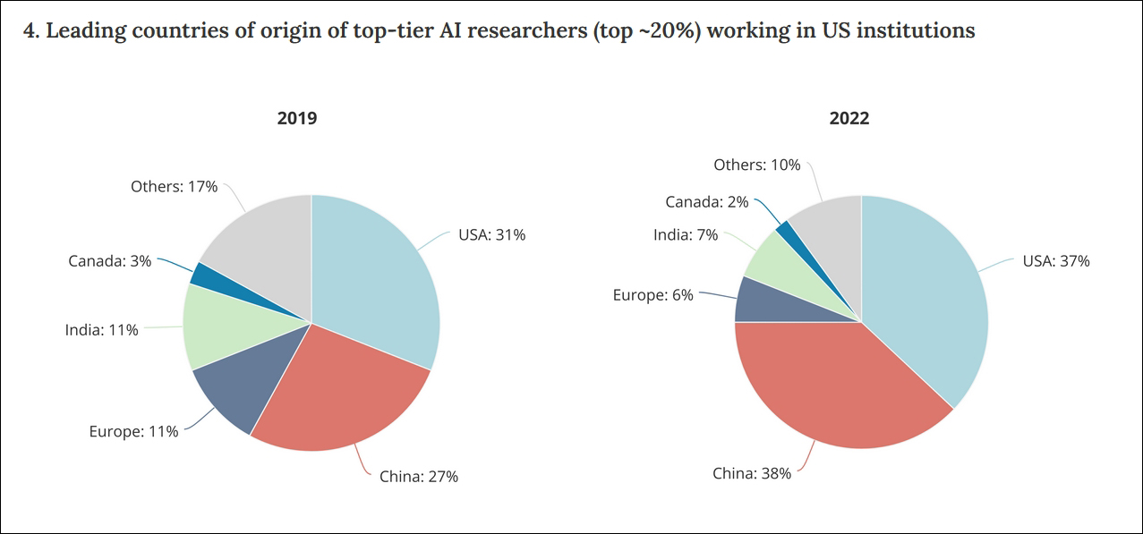 報道指出,越來越多的中國研究人員選擇留在中國發展。前述研究顯示,目前,美國仍擁有全球約42%的頂尖人才,但顯著低於三年前的59%;同期,在中國工作的AI頂尖人才出現明顯增加,從在計算中不被單獨列出,增多至佔全球12%。