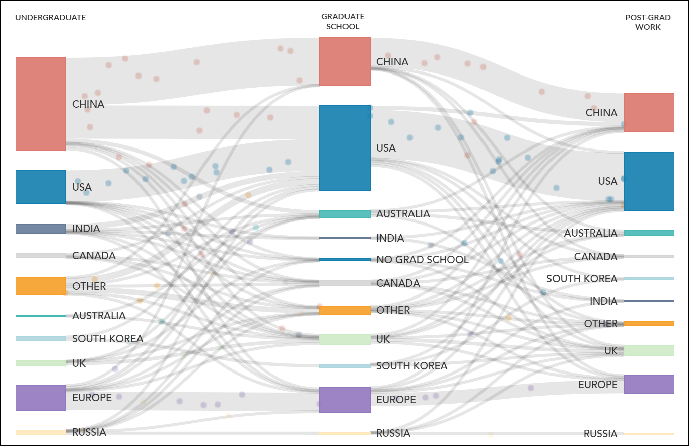 不過,這家美媒稱,中美之間“日益緊張的關係”也令部分人才對留美望而卻步。“在2010年代的大部分時間裏,美國受益於大量中國頂尖人才前往美國大學攻讀博士學位,他們當中大多數人留在美國。 但研究顯示,這一趨勢開始發生轉變。”