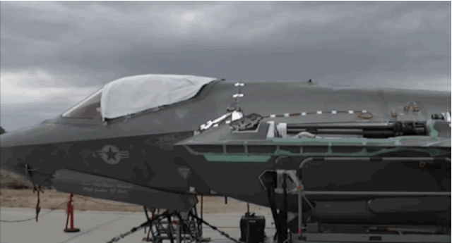 F-35A在地面測試航炮,可以看到取下蒙皮後航炮在機身內部的安裝位置