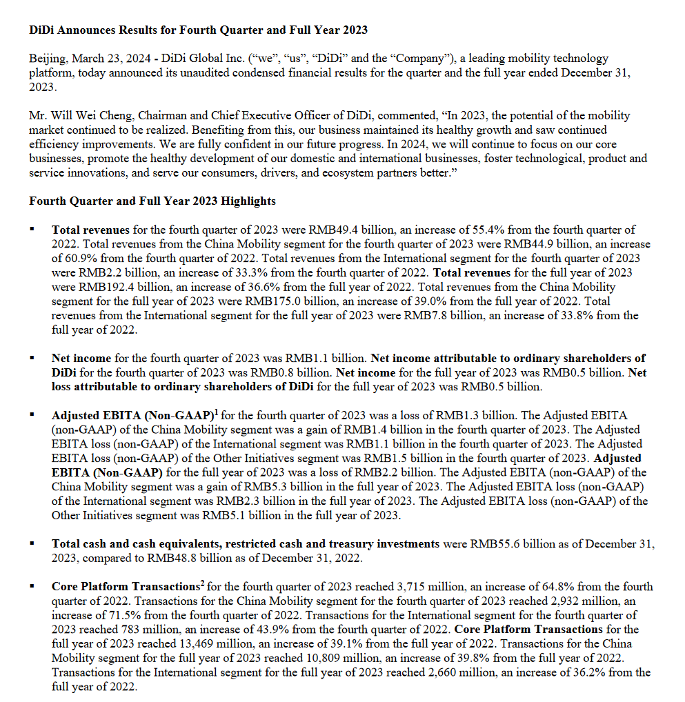3月23日,滴滴在其官網發佈2023年第四季度及全年業績。