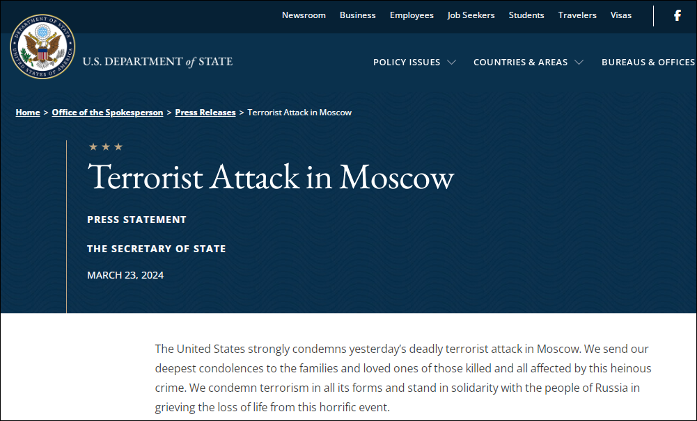 當地時間3月23日,美國國務卿布林肯在一份聲明中譴責了前一天在莫斯科發生的恐襲事件。“美國強烈譴責昨天在莫斯科發生的致命恐怖襲擊。我們向遇難者的家屬和親人以及所有受這一令人髮指的罪行影響的人,致以最深切的哀悼。我們譴責一切形式的恐怖主義,並與俄羅斯人民站在一起,為這一可怕事件造成的生命損失感到悲痛。”