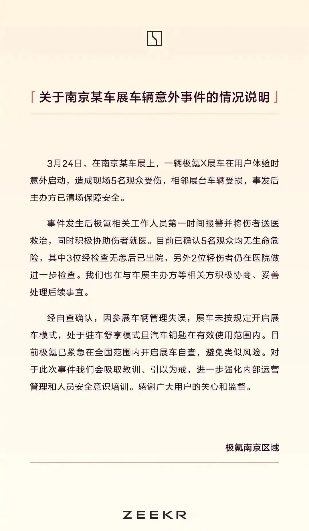 經自查確認,因參展車輛管理失誤,展車未按規定開啓展車模式,處於駐車舒享模式且汽車鑰匙在有效使用範圍內。目前極氪已緊急在全國範圍內開啓展車自查,避免類似風險。對於此次事件我們會吸取教訓、引以為戒,進一步強化內部運營管理和人員安全意識培訓。感謝廣大用户的關心和監督。