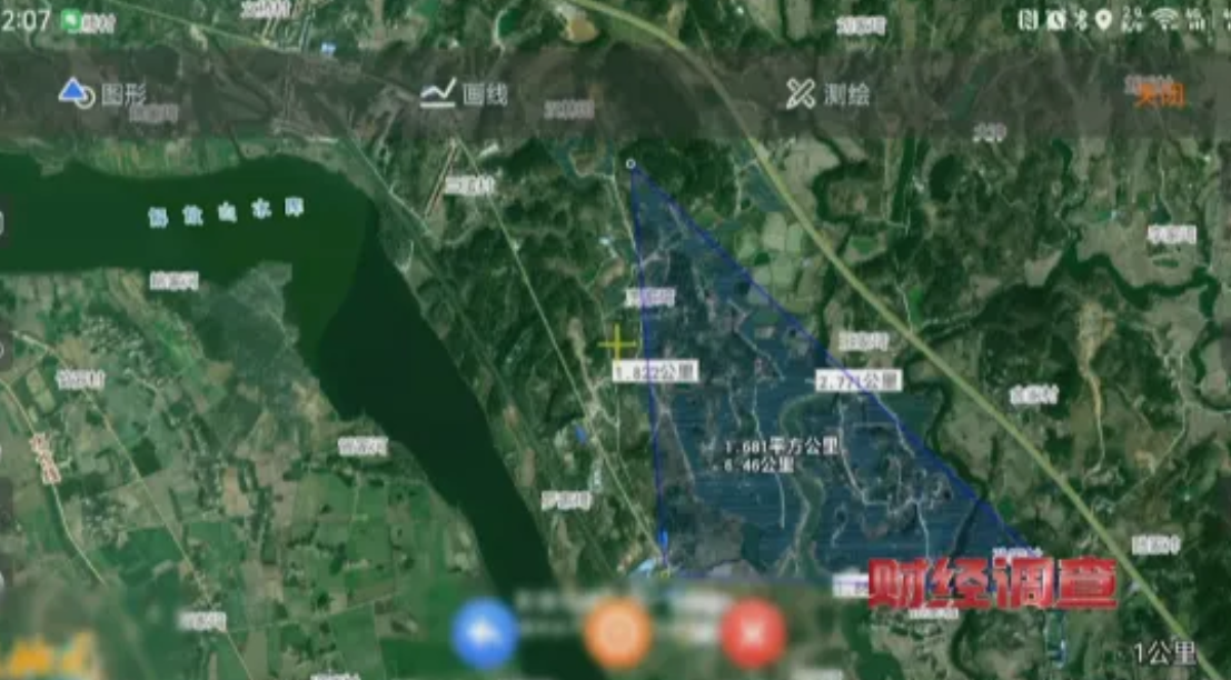 除了木梓鄉,記者還在安陸市其他地方發現了佔用基本農田甚至高標準農田建設光伏電站的情況。在安陸市洑水鎮,同樣有大面積連片光伏項目。根據衞星地圖顯示,這裏連片光伏近似直角三角形佈局,三角形的兩條直角邊近2公里長。