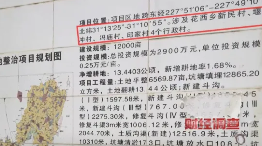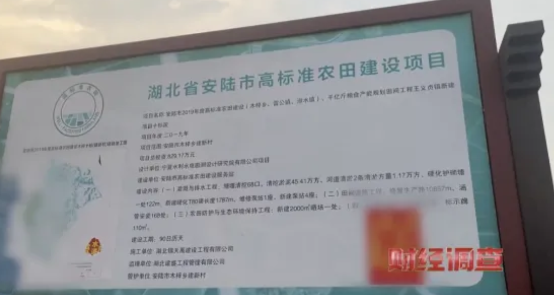 工作人員的説法和村民們反映的情況大相徑庭,真實的情況究竟是什麼?就在距離這片光伏陣列僅一路之隔的地方,記者看見了一塊湖北省安陸市高標準農田建設項目公告牌。