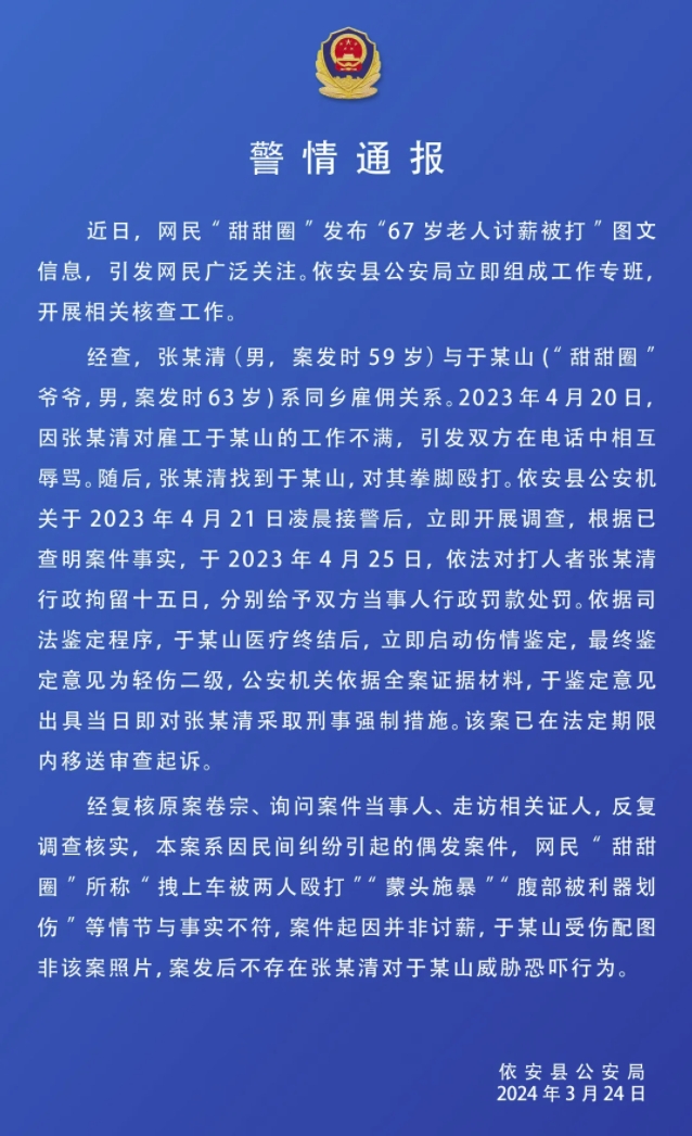 黑龍江省齊齊哈爾市依安縣公安局3月24日發佈警情通報稱,近日,網民“甜甜圈”發佈“67歲老人討薪被打”圖文信息,引發網民廣泛關注。依安縣公安局立即組成工作專班開展相關核查工作。