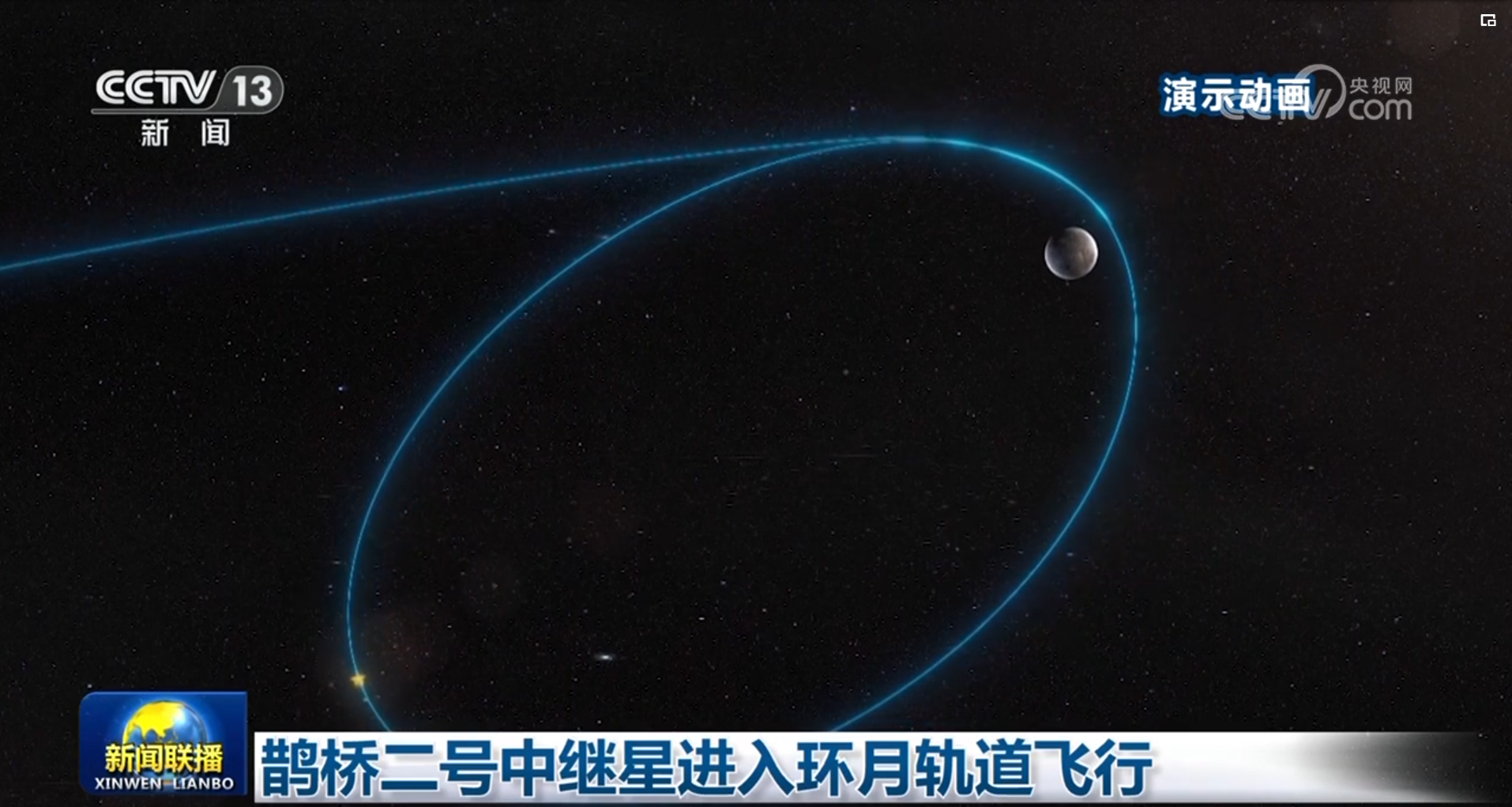 國家航天局今天宣佈,鵲橋二號中繼星經過約112小時奔月飛行,今天0時46分,在距月面約440公里處開始實施近月制動,約19分鐘後,順利進入環月軌道飛行。