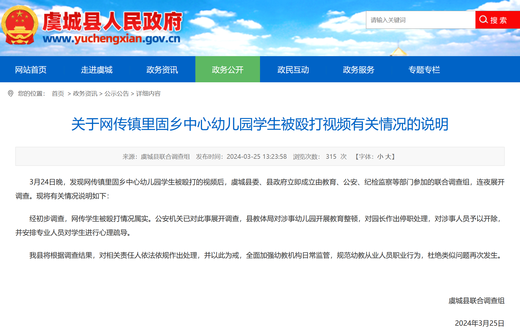 3月24日晚,發現網傳鎮裏固鄉中心幼兒園學生被毆打的視頻後,虞城縣委、縣政府立即成立由教育、公安、紀檢監察等部門參加的聯合調查組,連夜展開調查。現將有關情況説明如下: