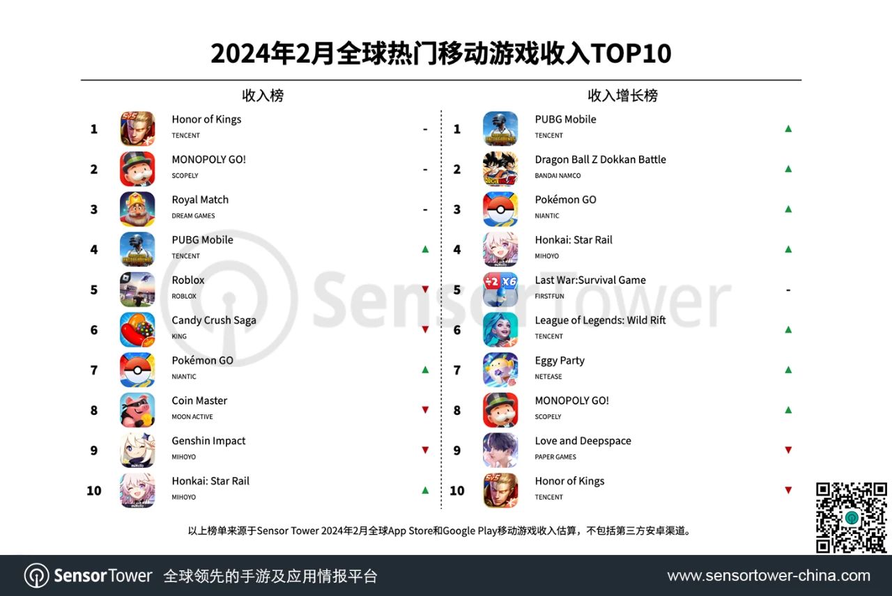 3月25日,全球移動應用及手遊情報平台Sensor Tower公佈了2024年2月全球熱門移動遊戲收入前十榜單。騰訊《王者榮耀》在全球 App Store 和 Google Play 吸金2.48億美元,蟬聯全球手遊暢銷榜冠軍,Scopely的大富翁遊戲《Monopoly GO!》以2.44億美元的收入排在第2位(數據不包括第三方安卓渠道)。