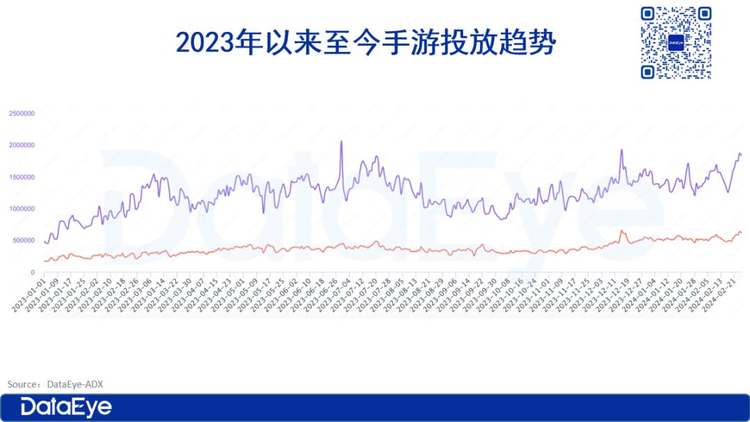 2023年1月——2024年2月手遊投放趨勢 數據來源:DataEye-ADX