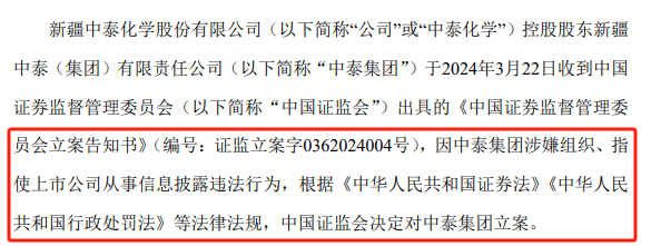 從消息層面來看,中泰化學3月24日晚間公告稱,其控股股東新疆中泰(集團)有限責任公司(下稱“中泰集團”)已被中國證監會立案。