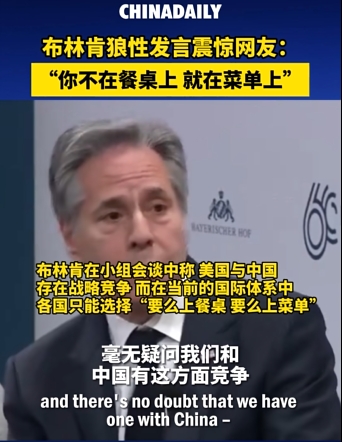 當地時間2月17日,慕尼黑安全會議小組會談,布林肯發表“上桌説”引發廣大爭議。圖片來源:中國日報