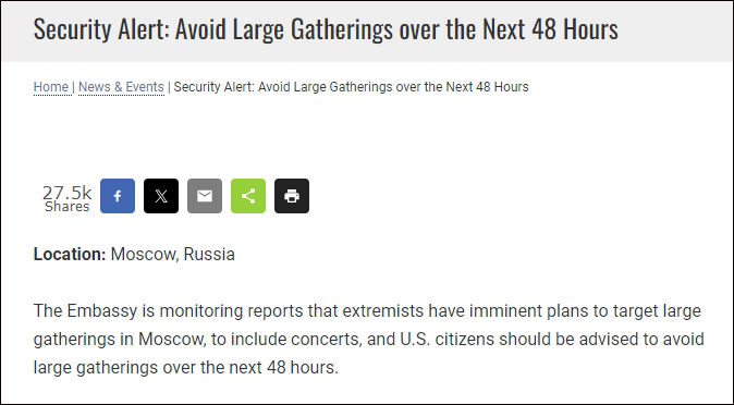 3月7日,美國駐俄大使館曾發表聲明:“有報道稱,極端分子即將對莫斯科大型集會(包括音樂會)發動襲擊”。圖片來源:美駐俄大使館網頁截圖