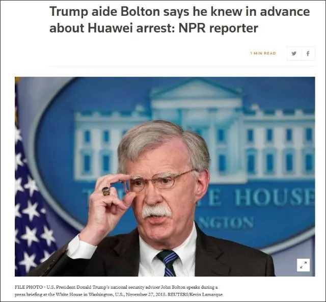 美國全國公共廣播電台報道稱,博爾頓事先知曉針對孟晚舟女士的扣押行動。圖片來源:NPR截圖