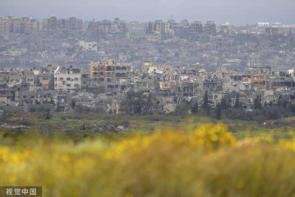 當地時間2024年3月18日,從以色列南部俯瞰加沙地帶被摧毀的建築物。圖源:視覺中國