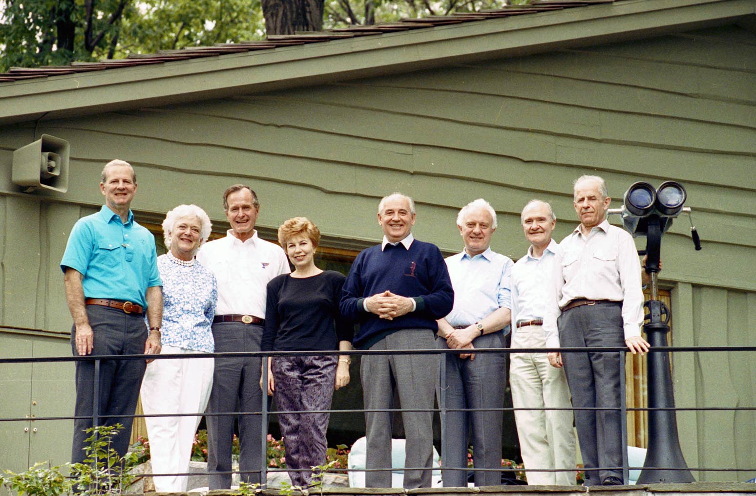 戈爾巴喬夫與老布什夫婦、時任美國國務卿詹姆斯·貝克(左一)在戴維營合影,1990年6月2日。圖自:喬治·赫伯特·沃克·布什總統圖書館