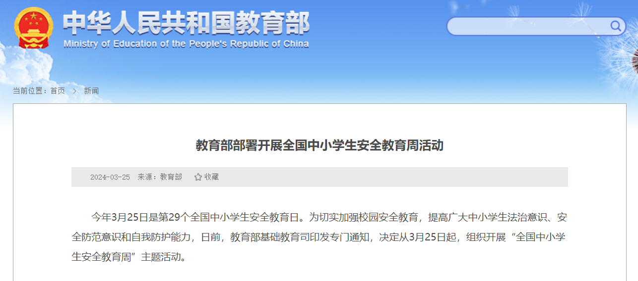 據教育部網站25日消息,今年3月25日是第29個全國中小學生安全教育日。為切實加強校園安全教育,提高廣大中小學生法治意識、安全防範意識和自我防護能力,日前,教育部基礎教育司印發專門通知,決定從3月25日起,組織開展“全國中小學生安全教育周”主題活動。