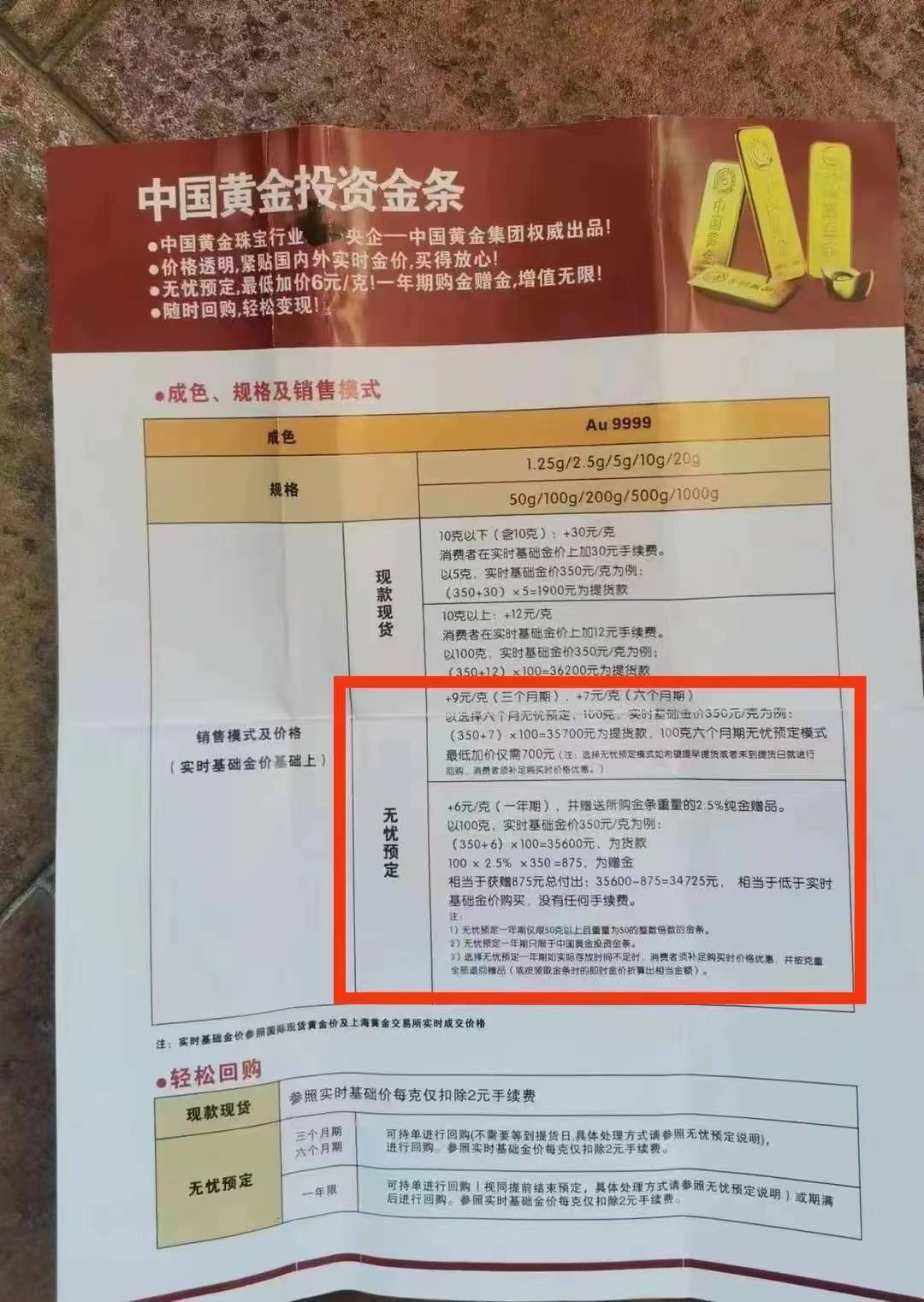 這些消費者此前在該店選擇店員推薦的“無憂預定”項目投資金條產品,稱購買金條後可以將金條存於店內,每年每50g返還1.25g黃金,此外該金條可以隨時取出或按當天金價折算現金。根據當時的宣傳頁,如果消費者選擇“無憂預訂”,會在實時金價的基礎上僅增加6元/克(一年期),並贈送所購金條重量2.5%的純金贈品。