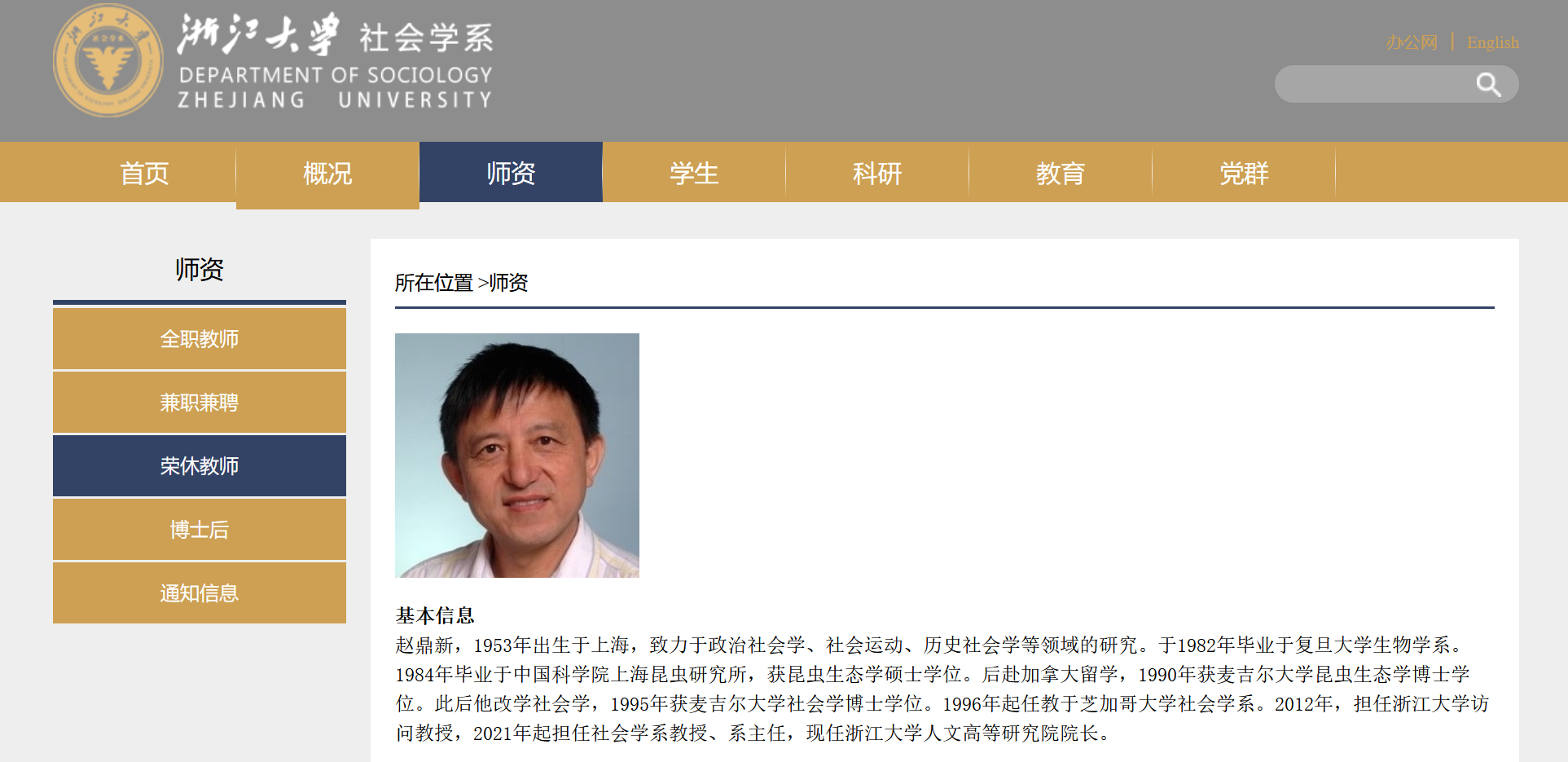 值得一提的是,目前在浙大社會學系網站上,趙鼎新的個人信息出現在榮休教師一欄中。