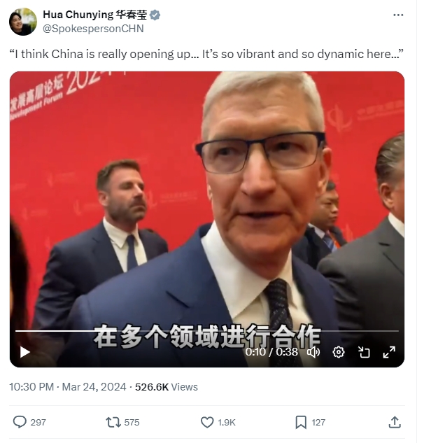 3月24日,外交部部長助理、外交部新聞司司長華春瑩,在社交媒體X(原推特)上轉發了一段美國蘋果公司首席執行官庫克,在中國發展高層論壇2024年年會期間接受媒體採訪的視頻。