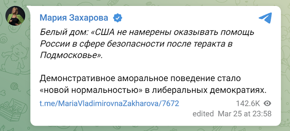 扎哈羅娃在社交平台上發文回應白宮聲明