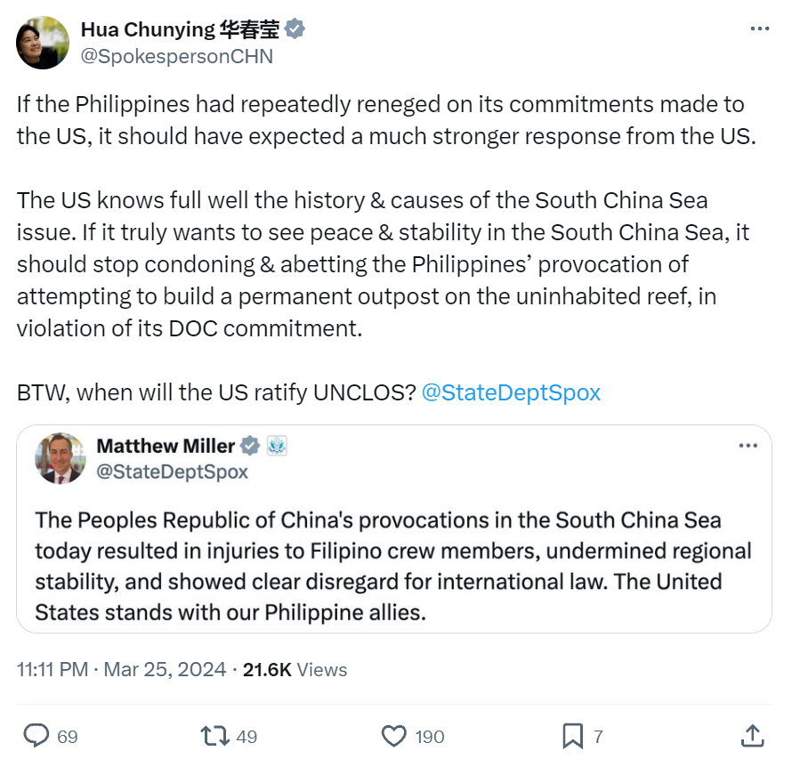 當地時間24日,美國務院發言人馬修·米勒在X(原推特)上,發文炒作稱:“今天中國在南海的挑釁行為導致菲律賓船員受傷,破壞了地區穩定,並且明顯無視國際法。美國與我們的菲律賓盟友站在一起。”