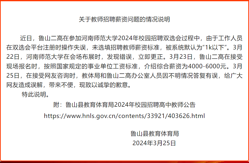 據微信公眾號“魯山教育”消息,3月25日河南省平頂山市魯山縣教育體育局發佈關於教師招聘薪資問題的情況説明: