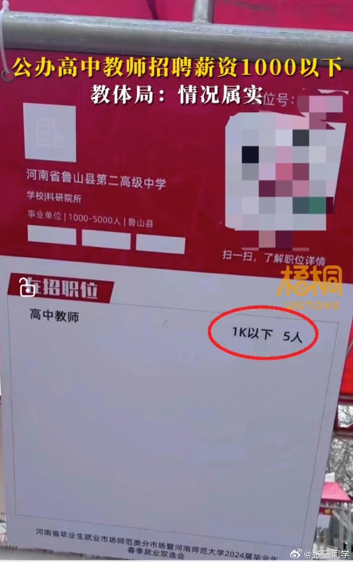 據此前報道,近日,河南新鄉有網友稱雙選會現場看到河南一公辦高級中學高中教師招聘5人,薪資在1000元以下,引發網友關注。