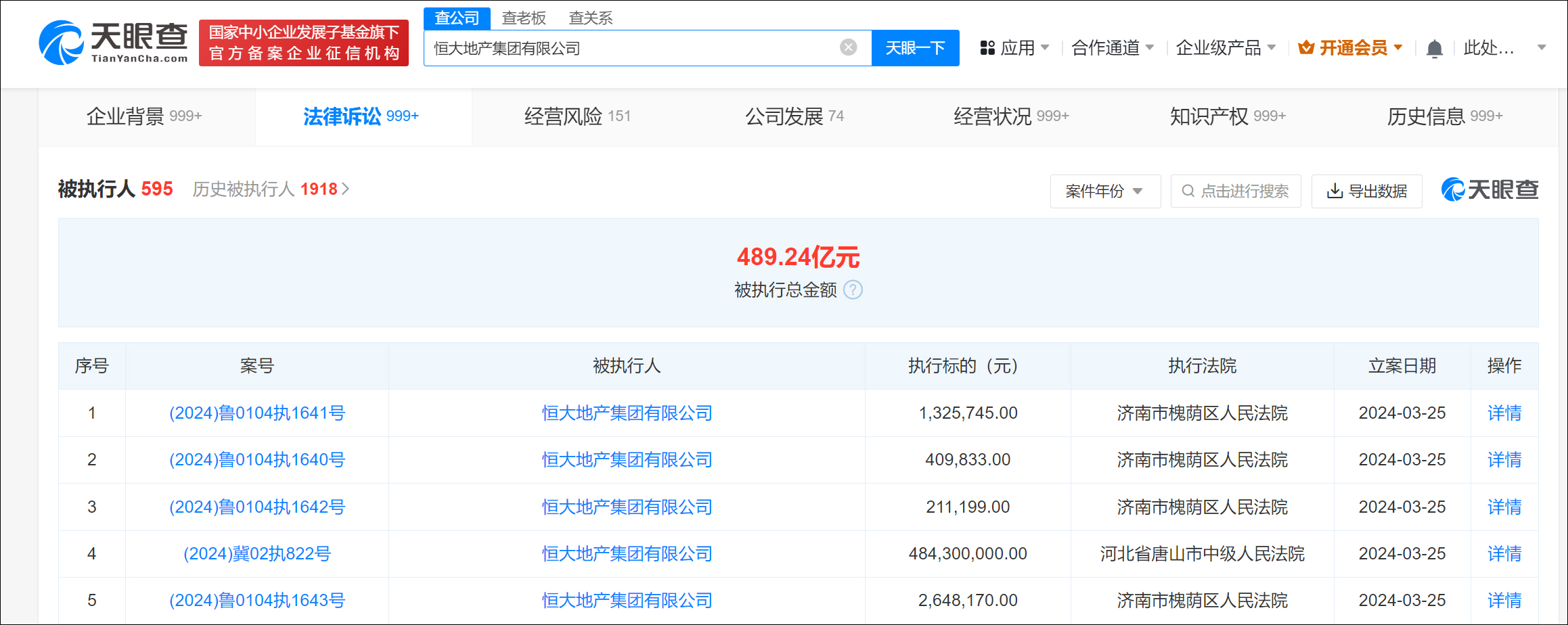 天眼查法律訴訟信息顯示,近日,恒大地產集團有限公司新增5則被執行人信息,執行標的合計4.8億餘元,涉及票據追索權糾紛等案件,部分案件被執行人還包括恒大地產集團北京有限公司、唐山恆瀚邑房地產開發有限公司等,執行法院包括濟南市槐蔭區人民法院、河北省唐山市中級人民法院。