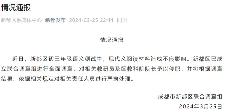 近日,新都區初三年級語文測試中,現代文閲讀材料造成不良影響。新都區已成立聯合調查組進行全面調查,對相關教研員及區教科院院長予以停職,並將根據調查結果、依據相關規定對相關責任人員進行嚴肅處理。