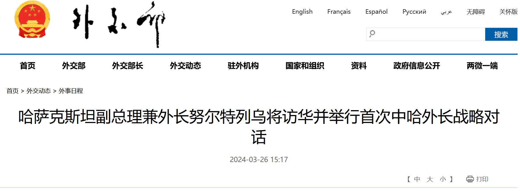 哈薩克斯坦副總理兼外長努爾特列烏將訪華並舉行首次中哈外長戰略對話 guancha 2024-03-26 外交部網站26日消息,外交部發言人林劍宣佈: 應中共中央政治局委員、外交部長王毅邀請,哈薩克斯坦副總理兼外長努爾特列烏將於3月28日至30日對中國進行正式訪問並舉行首次中哈外長戰略對話。