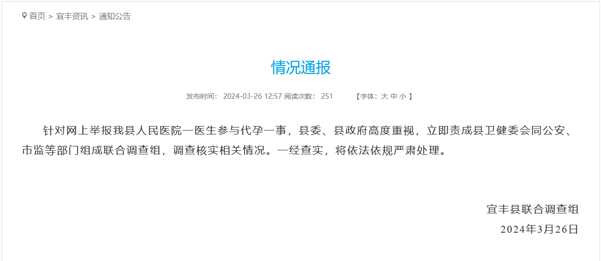 據宜豐縣人民政府網站26日消息,針對該縣一醫生涉嫌與代孕機構合作一事,江西宜豐縣聯合調查組3月26日發佈情況通報:組成聯合調查組,核實相關情況。