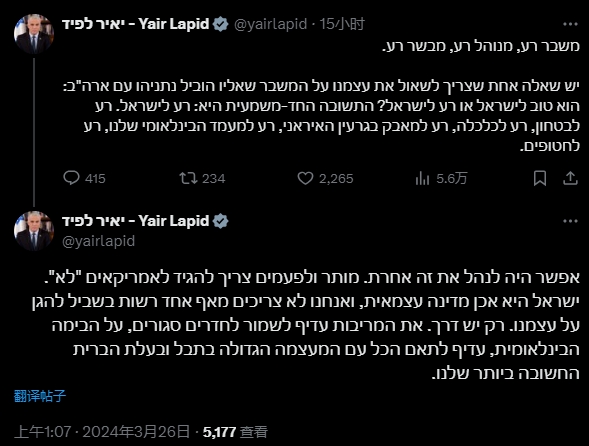 以色列前總理亞伊爾·拉皮德批評內塔尼亞胡,推文截圖