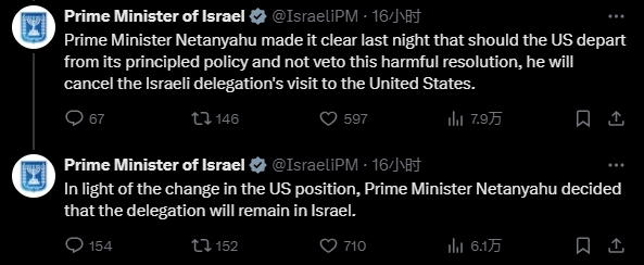 以色列總理辦公室25日發佈聲明稱,內塔尼亞胡認為美國投下棄權票的舉動“令人遺憾”,意味着美國“背離了迄今為止在安理會的一貫立場”,選擇支持“將呼籲停火與釋放人質聯繫起來的決議”。