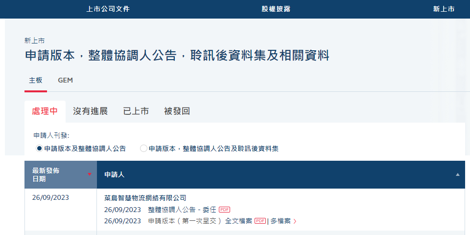 菜鳥成立於2013年,其主要業務包括國際物流、國內物流與科技及其他服務。2023年5月,阿里宣佈了其資產重組計劃,其中就包括菜鳥IPO,當時阿里認為,單獨上市更能體現菜鳥作為阿里重要業務的價值。另據香港聯交所網站去年9月26日公示的信息,菜鳥彼時正式提交了上市申請,披露招股申請文件。