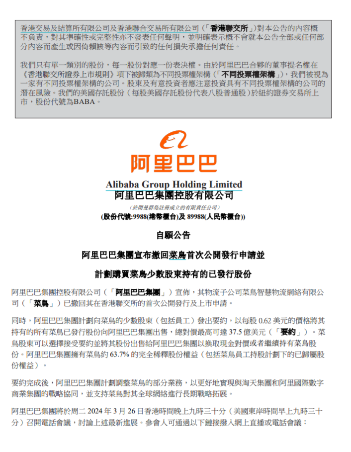 3月26日,阿里巴巴集團發佈公告,宣佈決定撤回菜鳥上市申請,並要約收購菜鳥少數股東的股權和員工已歸屬的股權。本次收購涉及金額達到37.5億美元。對於這一決定,阿里方面表示,“為更好加強與阿里電商業務協同,以及繼續支持菜鳥擴大全球物流網絡投入。”