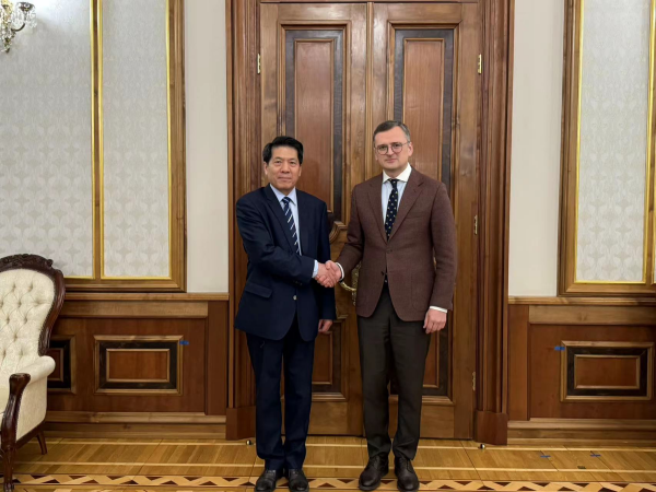 3月7日,李輝特使乘火車抵達烏克蘭首都基輔,與烏方舉行會談,圖為李輝特使與烏外長庫列巴。圖自中國外交部網站