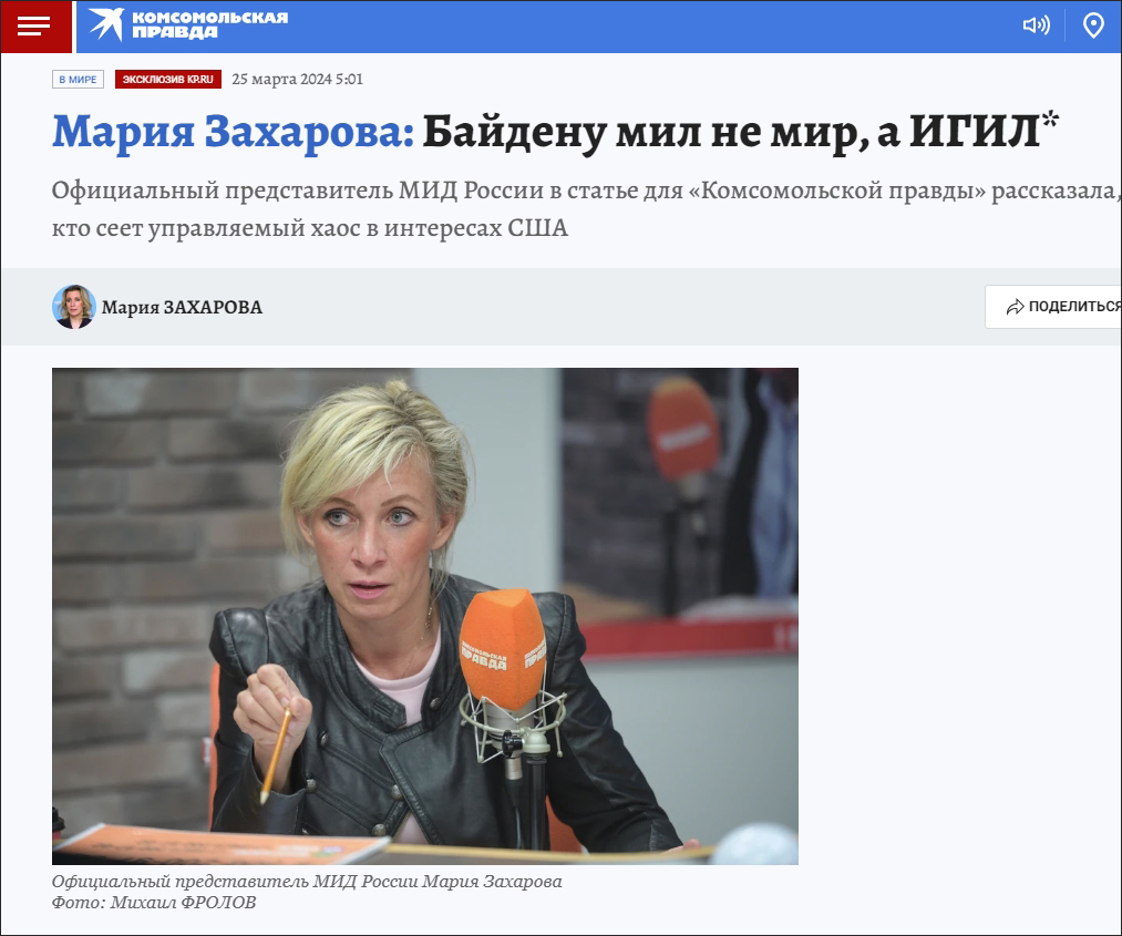 當地時間3月25日,俄羅斯外交部發言人扎哈羅娃在《共青團真理報》上發佈題為《拜登愛的不是世界,而是“伊斯蘭國”》的文章