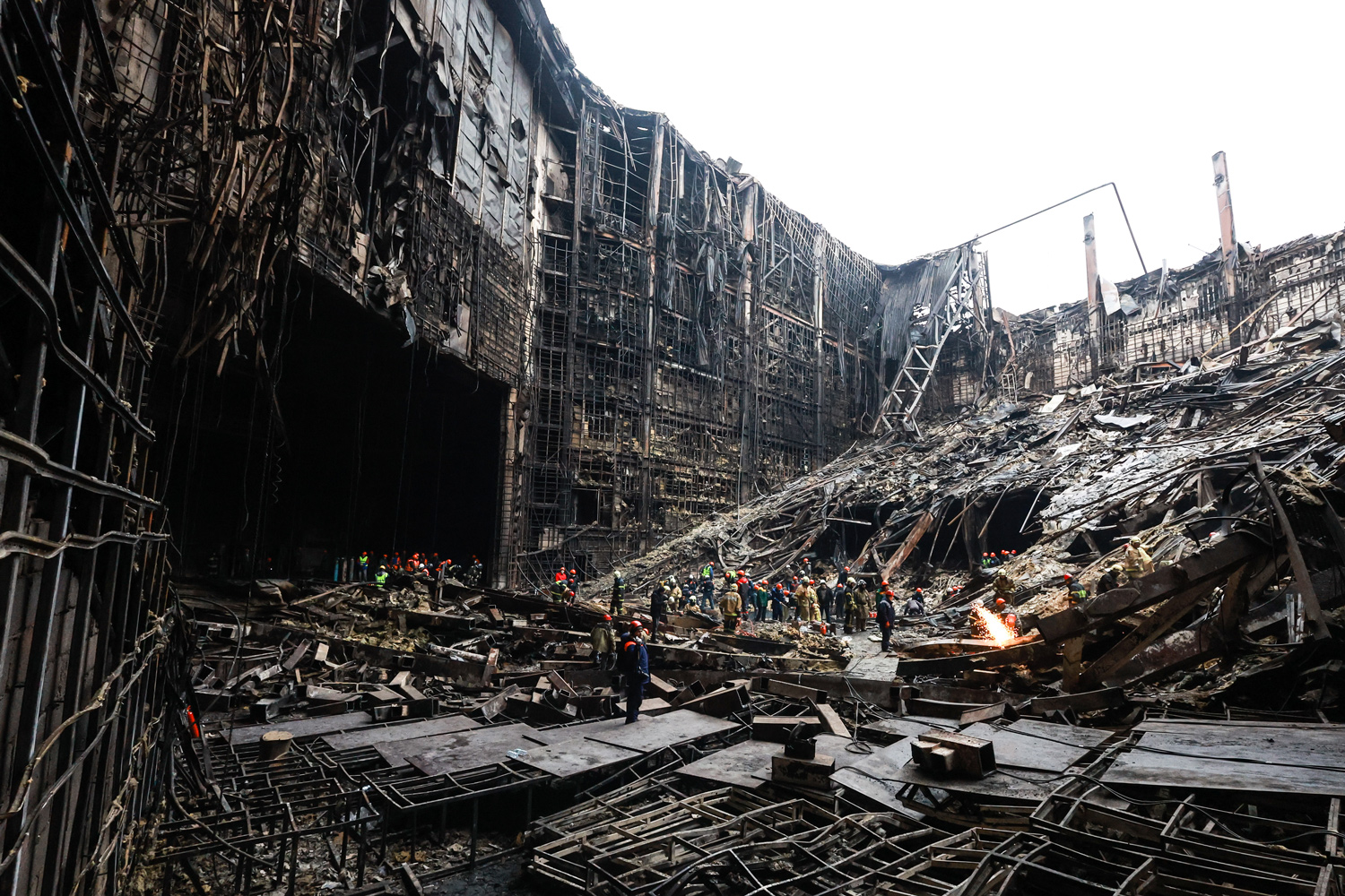 莫斯科音樂廳遭恐襲後,滿地廢墟,屋頂嚴重坍塌。圖自IC photo