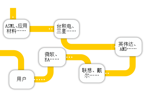 在其所在的產業鏈上,上游有ASML、應用材料為代表的若干家半導體設備製造商,往下是台積電、三星為代表的半導體製造商。在英偉達的下游,有終端消費設備供應商如聯想、戴爾,有遊戲軟件開發商如微軟、EA等。最下面是消費者。