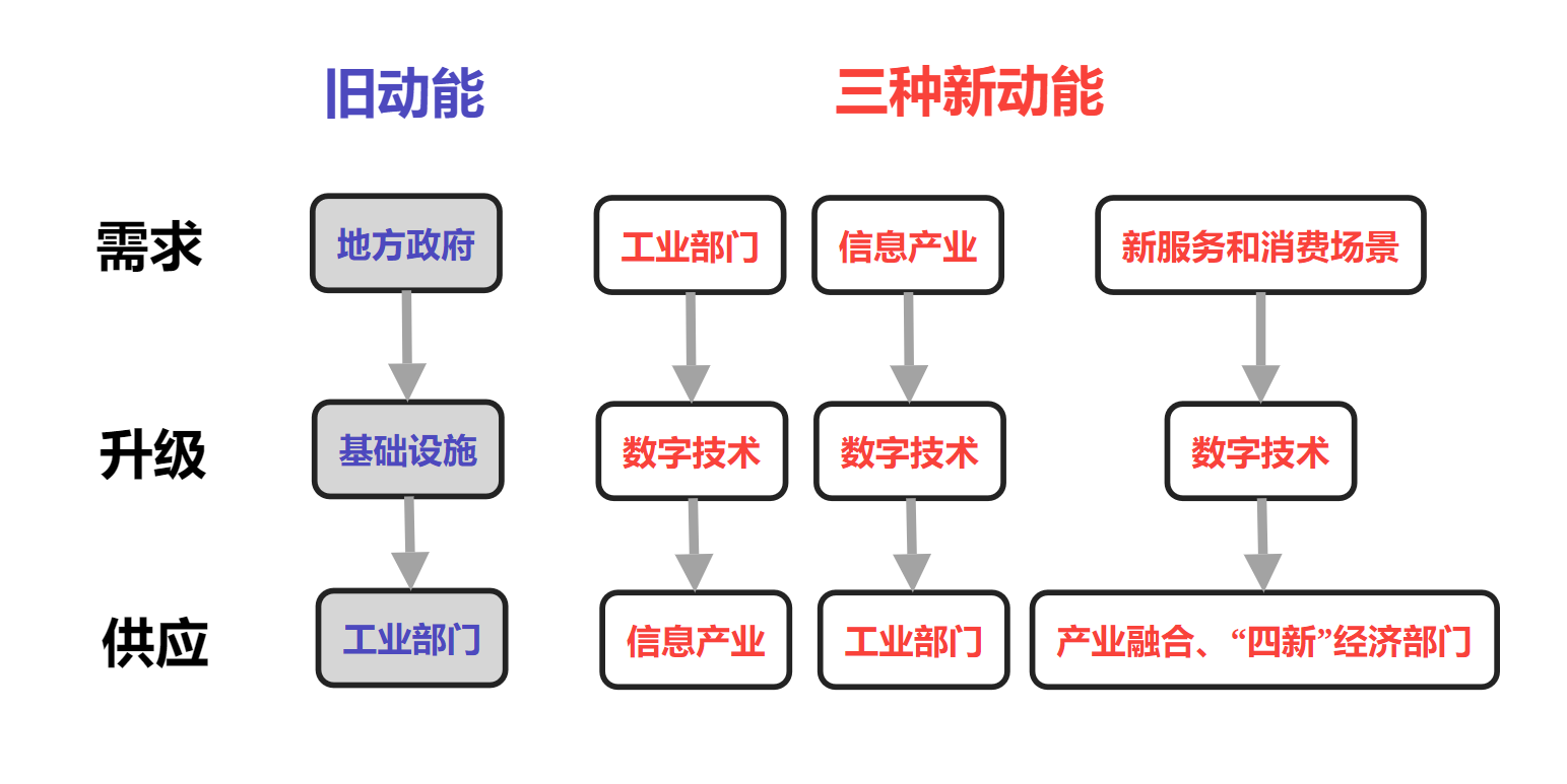 圍繞“土地財政”模式,地方政府先舉債再賣地償債,通過大規模基礎設施建設,直接拉動經濟需求,把這種模式説成是“舊動能”,並非是要製造二分對立。未來隨着數字經濟的發展,規劃更多的數據中心等“新基建”仍然是必要的,加上配套的電力供應,仍然有可觀的基建動能。