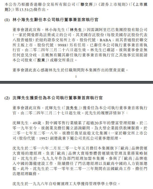 3月26日晚間,高鑫零售在港交所發佈公告:任命沈輝擔任高鑫零售執行董事兼CEO,林小海辭任高鑫零售CEO,調回阿里巴巴集團另有任用。